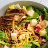 Sa lát cá hồi trộn với rau bó xôi, hành đỏ, hạt thông, trái bơ và sốt giấm